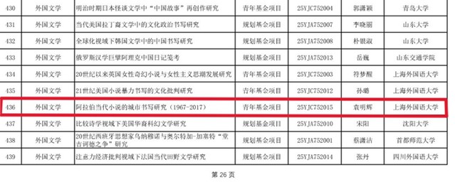 近日,教育部社会科学司公示了2025年度教育部人文社会科学研究一般项目立项结果,上海外国语大学东方语学院阿拉伯语系袁明辉老师申请的课题“阿拉伯当代小说的城市书写研究(1967-2017)”获批教育部人文社会科学研究青年基金项目立项。