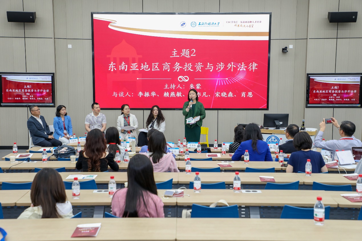 第二场对话的主题是“东南亚地区商务投资与涉外法律”,由东方语学院泰语专业教师朱蒙副教授主持。五位对话嘉宾均为东方语学院校友:阿拉伯语校友、上海九骏实业发展有限公司总经理李振华,印尼语校友、拓维律师事务所驻印尼管理合伙人赖燕敏,泰语校友、广东外语外贸大学南国商学院泰语专业教师林亦凡,越南语校友郑州大学历史学院世界史系教师宋晓森,以及越南语校友、复旦大学管理学院《管理视野》编辑部肖恩。他们基于各自职业发展经历,分析了越南、印尼、泰国等东南亚出海热点国家的商务投资与社会法律环境,探讨了中国企业出海东南亚的机遇与挑战。同时,他们还强调了外语人才在涉外法律服务中的重要性,以及“一带一路”建设对中国经济高质量发展的重大作用。对话嘉宾还分别分享了留基委项目资助留学经历为各自学业和职业发展带来的收益。