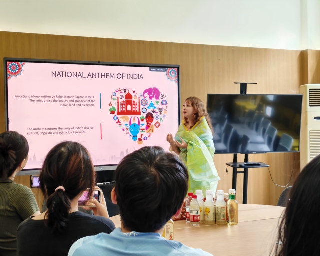 接下来是双方学生的展示环节。21级印地语班的全体同学向印度留学生献唱了印地语歌曲《I Will Miss You》,歌曲给活动带来了温馨而又欢乐的氛围。而两位印度留学生则穿着印度传统服饰,从文化、名胜、习俗、经贸等多方面向大家展示了他们眼中的印度,为学生学习、研究印度文化提供了新的、有趣的视角。