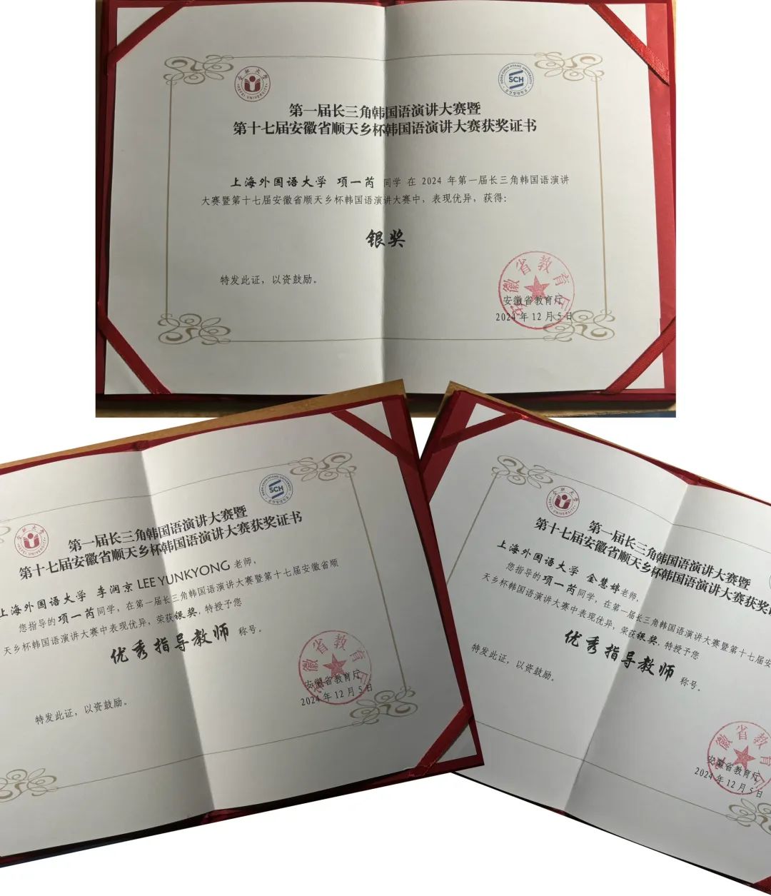 2024年12月5日,在安徽合肥大学隆重举行的长三角韩国语演讲大赛上,上海外国语大学东方语学院朝鲜语系23级本科生项一芮,凭借扎实的语言功底、深刻的文化理解和精彩的演讲表现,从众多参赛选手中脱颖而出,荣获银奖,李润京老师和金慧婷老师获得了优秀指导教师奖,为学校争得了荣誉。
