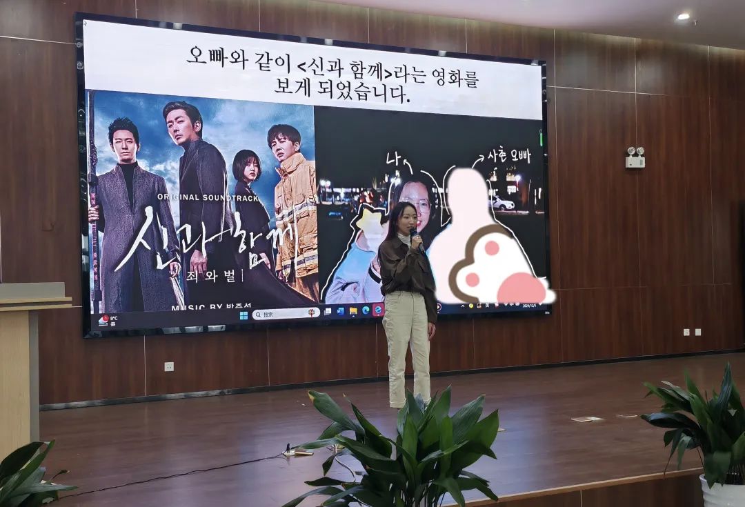 比赛主题丰富多样,要求选手结合自身经历,围绕韩国文化展开深入思考和表达。项一芮同学选取了韩国电影《与神同行》作为演讲主题,深入探讨了电影中蕴含的生死观、伦理观以及对个人成长的启示。她用流利的朝鲜语、饱满的情感,将观众带入了一个充满哲思和人文关怀的电影世界。